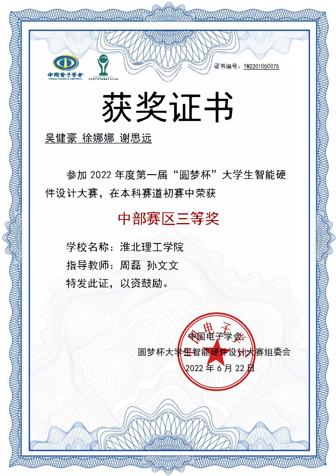 近日,由中国电子学会主办,北京航空航天大学、电子发烧友等单位承办的2022年第一届“圆梦杯全国大学生智能硬件设计大赛”的初赛落下帷幕。经过中部赛区(湖北、湖南、江西、河南、安徽)五个省份的激烈竞争后,十大买球官网电子信息工程1班吴健豪、谢思远、徐娜娜同学组成的本科参赛小组荣获了中部赛区的三等奖。