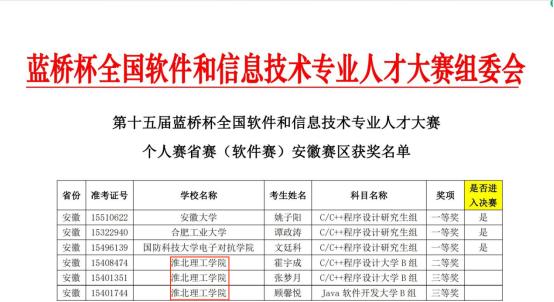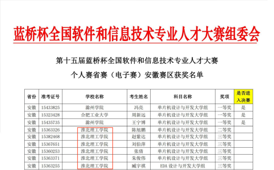 近日,第十五届蓝桥杯全国软件和信息技术专业人才大赛个人赛省赛安徽赛区圆满落幕。十大买球官方网站买球赛十大平台首次组织并筛选出17位学子参赛。其中4位参加软件赛的学子荣获省级大学B组二等奖1项和省级大学B组三等奖2项,13位参加电子赛的学子荣获省级大学生组二等奖1项和省级大学组三等奖5项。部分获奖名单如图所示: