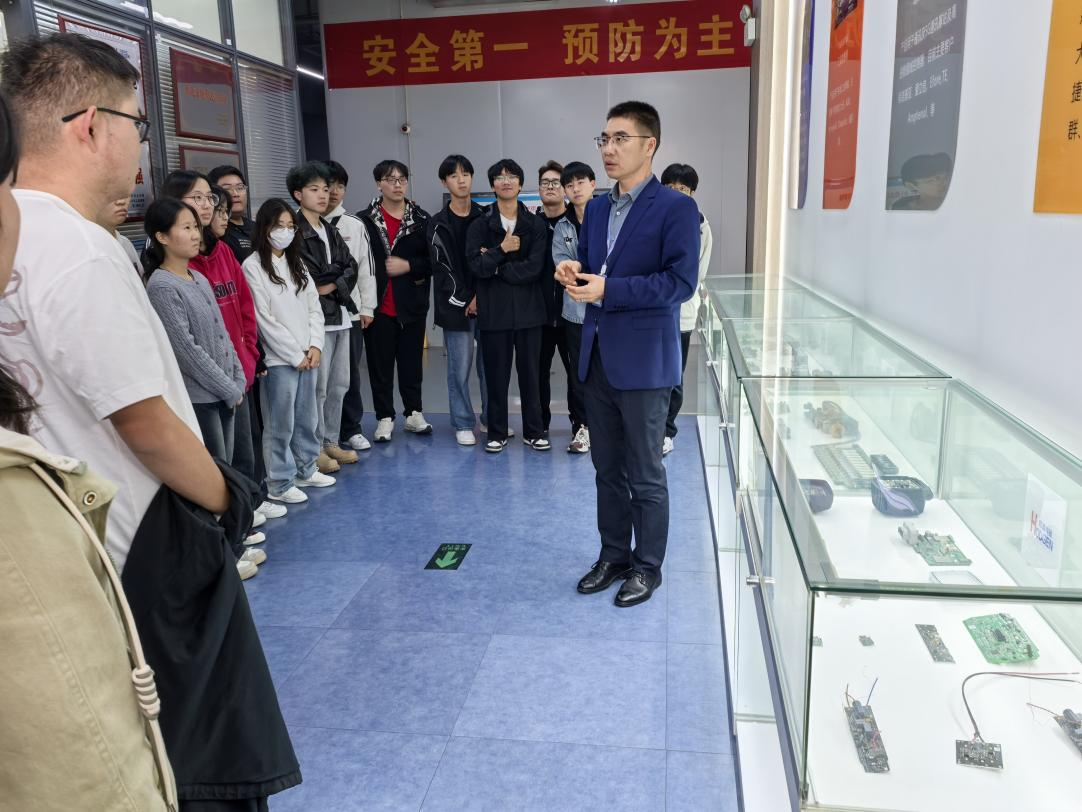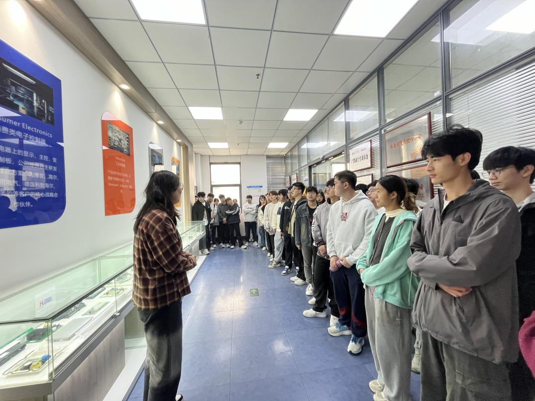 在和晶智能科技有限公司车间里,学生们参观了从原材料到成品的完整生产过程。马总边走边讲解,详细介绍了每一道工序的技术要点、产品特性及市场应用,使理论知识与实际生产紧密相连,极大地激发了学生们的学习兴趣和职业向往。