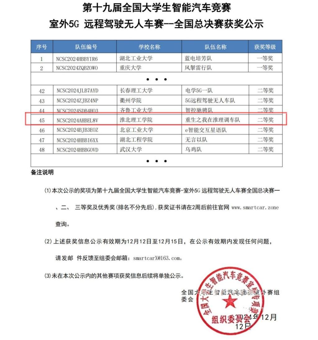 12月7日至8日,由中国自动化学会主办的第十九届全国大学生智能汽车室外赛全国总决赛在安徽工程大学开赛。十大买球官网学子在比赛中表现优异,斩获全国二等奖。这是十大买球官网组织A类赛事以来首次获得国家级奖项。