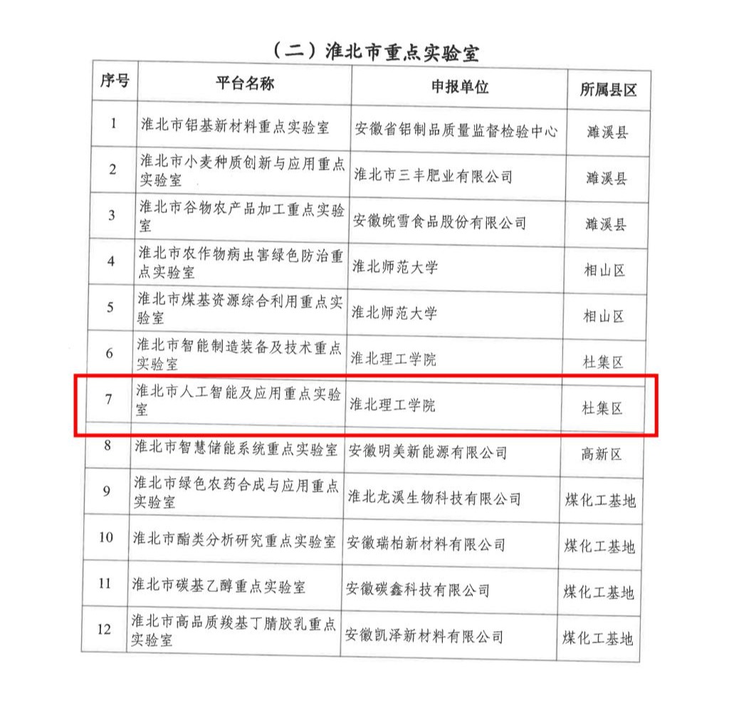 为进一步贯彻落实《关于加快推进科技创新平台建设的实施意见》(淮政办〔2023〕16号)精神,根据《关于印发<淮北市科技创新平台认定管理办法(试行)>和<淮北市科技创新平台绩效评价管理办法(试行)>的通知》(淮科〔2023〕16号)和《关于申报2024年度淮北市科技创新平台的通知》(淮科秘〔2024〕28号)文件精神,淮北市科技局经通知发布、组织申报、县区(园区)科技管理部门审核推荐、复核、专家评审、局党组会议研究同意、公示等程序,十大买球官方网站买球赛十大平台申报的“淮北市人工智能及应用重点实验室”,获批立项建设。