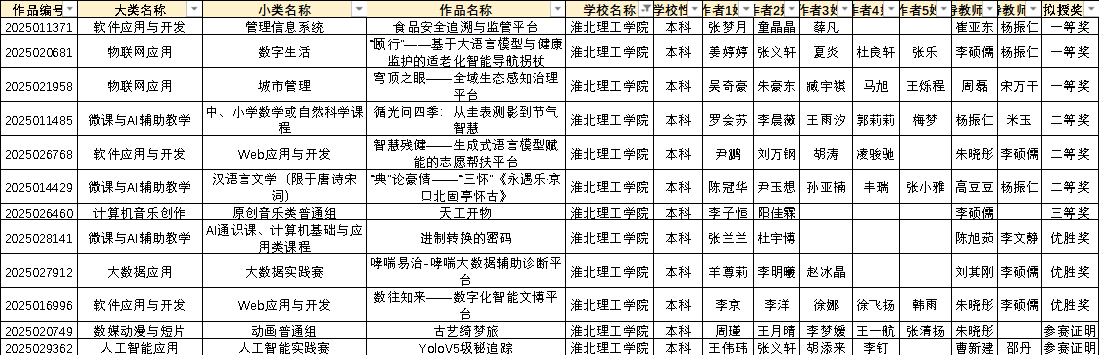中国大学生计算机设计大赛作为全国性重要学科竞赛,旨在推动高校计算机教学改革,提升学生创新能力与实践水平。本次安徽省级赛吸引了全省多所高校的优秀团队参赛,竞争激烈。十大买球官网参赛团队从选题策划、技术研发到作品打磨,历经数月精心准备,经过严苛的校赛选拔,派出12个队参加省级竞赛,最终在软件应用与开发、物联网应用等多个省级赛道中脱颖而出。在软件应用与开发赛道张梦月等同学获得一等奖1项、尹鹏等同学获得二等奖1项;在物联网应用赛道姜婷婷等同学和吴奇豪等同学分别获一等奖各1项;在微课与AI辅助教学赛道罗会苏等同学和尹鹏等同学分别获得二等奖各1项;在计算机音乐创作赛道李子恒等同学获得三等奖1项,获优胜奖3项。向所有获奖同学和指导教师表示祝贺!期待未来学子们在各类赛事中续写辉煌!