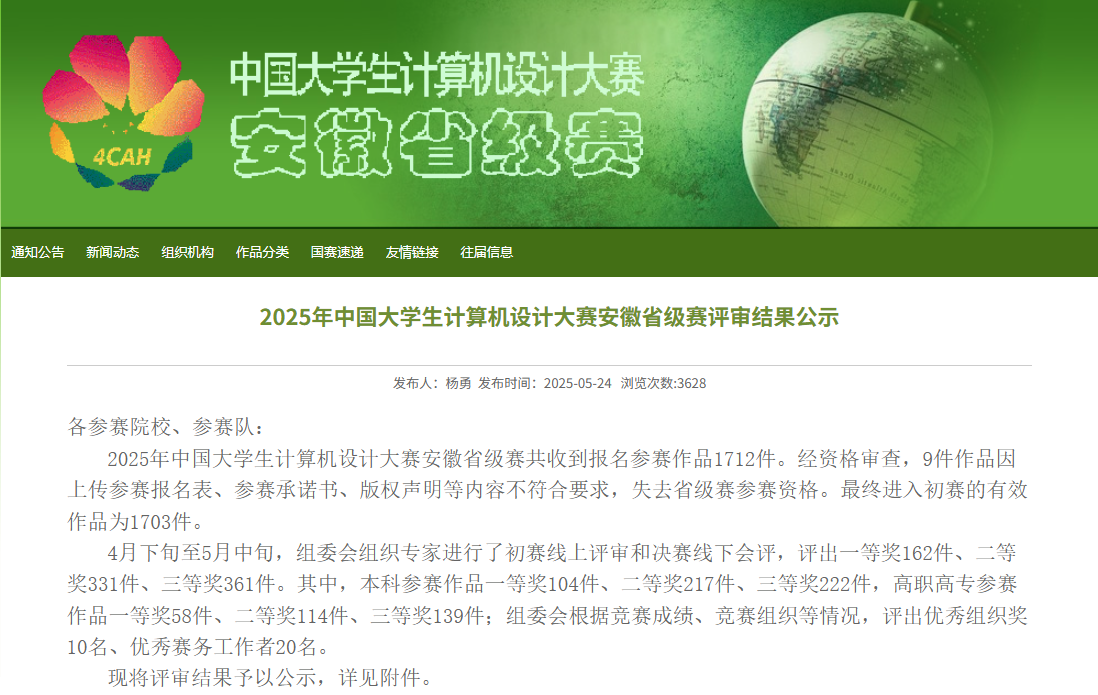 十大买球官网买球赛十大平台学子在2025年中国大学生计算机设计大赛安徽省级赛中表现亮眼,凭借扎实的专业功底与创新实践能力,斩获多项荣誉。本次大赛中,十大买球官网学生共获得一等奖3项、二等奖3项、三等奖1项。取得了获一等奖数在全省参赛的43所本科高校并列第9名好成绩。其中4项作品被推荐参加在7月和8月份举行的全国总决赛。