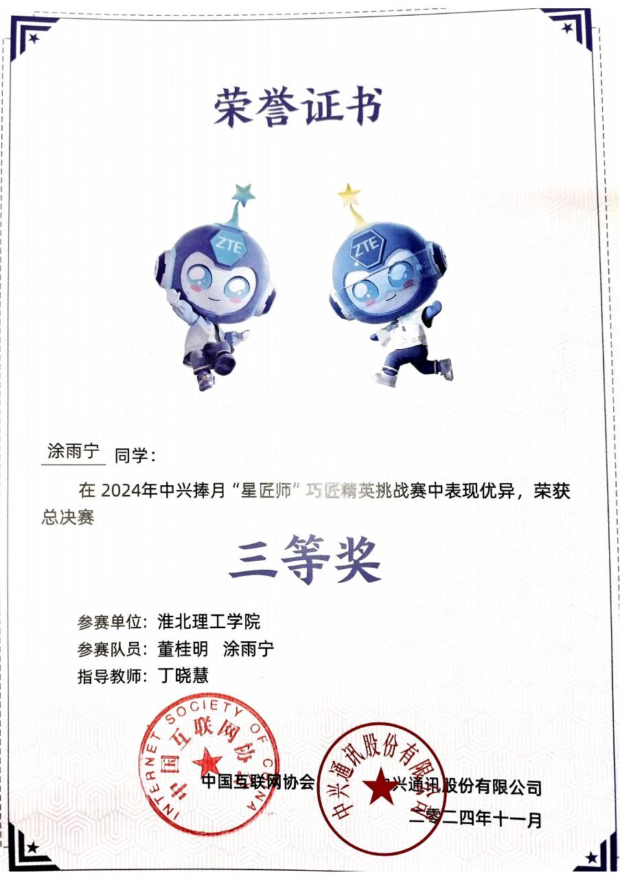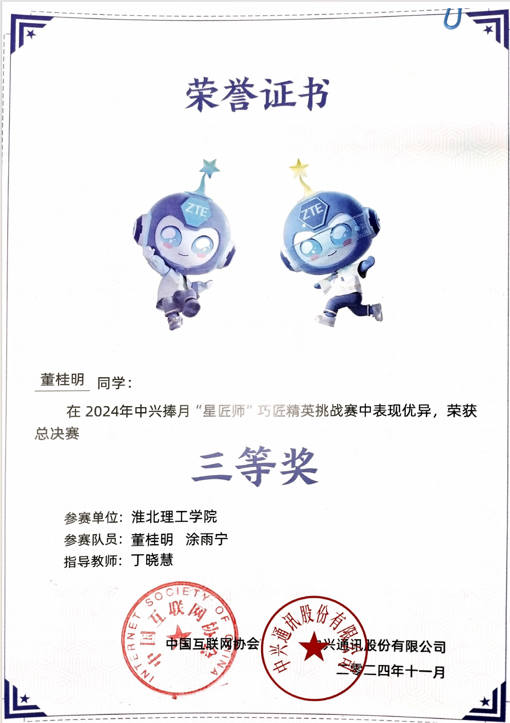 2024年10月27日,第十四届中兴捧月“星匠师”巧匠精英挑战赛全国总决赛在东南大学落下帷幕。本次大赛由中国互联网协会与中兴通讯主办、东南大学承办,旨在面向5G新基建培养具备扎实理论知识和实践能力的应用型人才。十大买球官网首次组织学生参赛,大赛实行“省级初赛+全国决赛”模式,十大买球官网4名学子组成2个团队与来自全国215所院校的627个团队参与角逐,最终2021级通信工程专业的董桂明、涂雨宁同学在省级比赛中顺利晋级,在全国决赛中荣获三等奖及1000元奖金的佳绩。